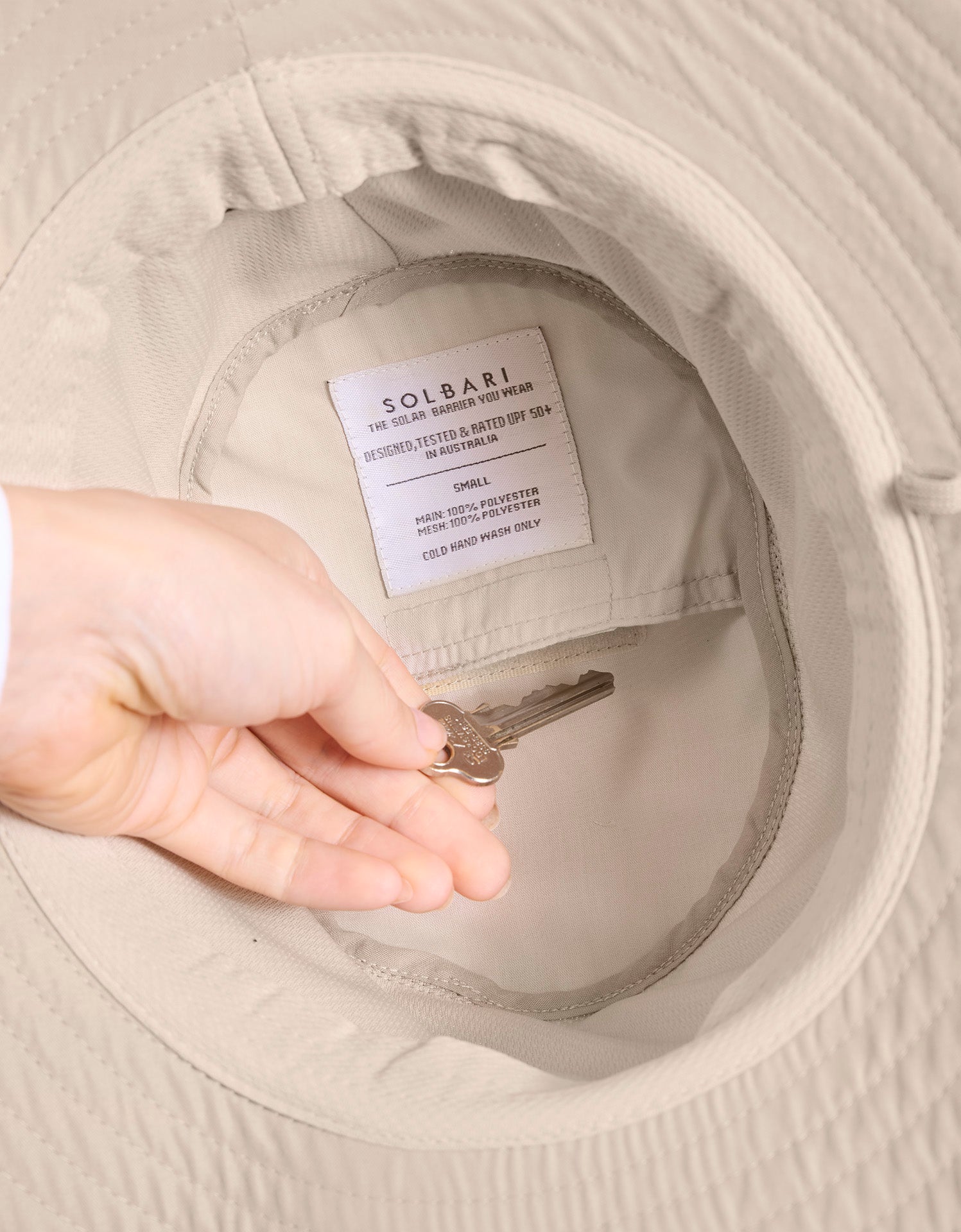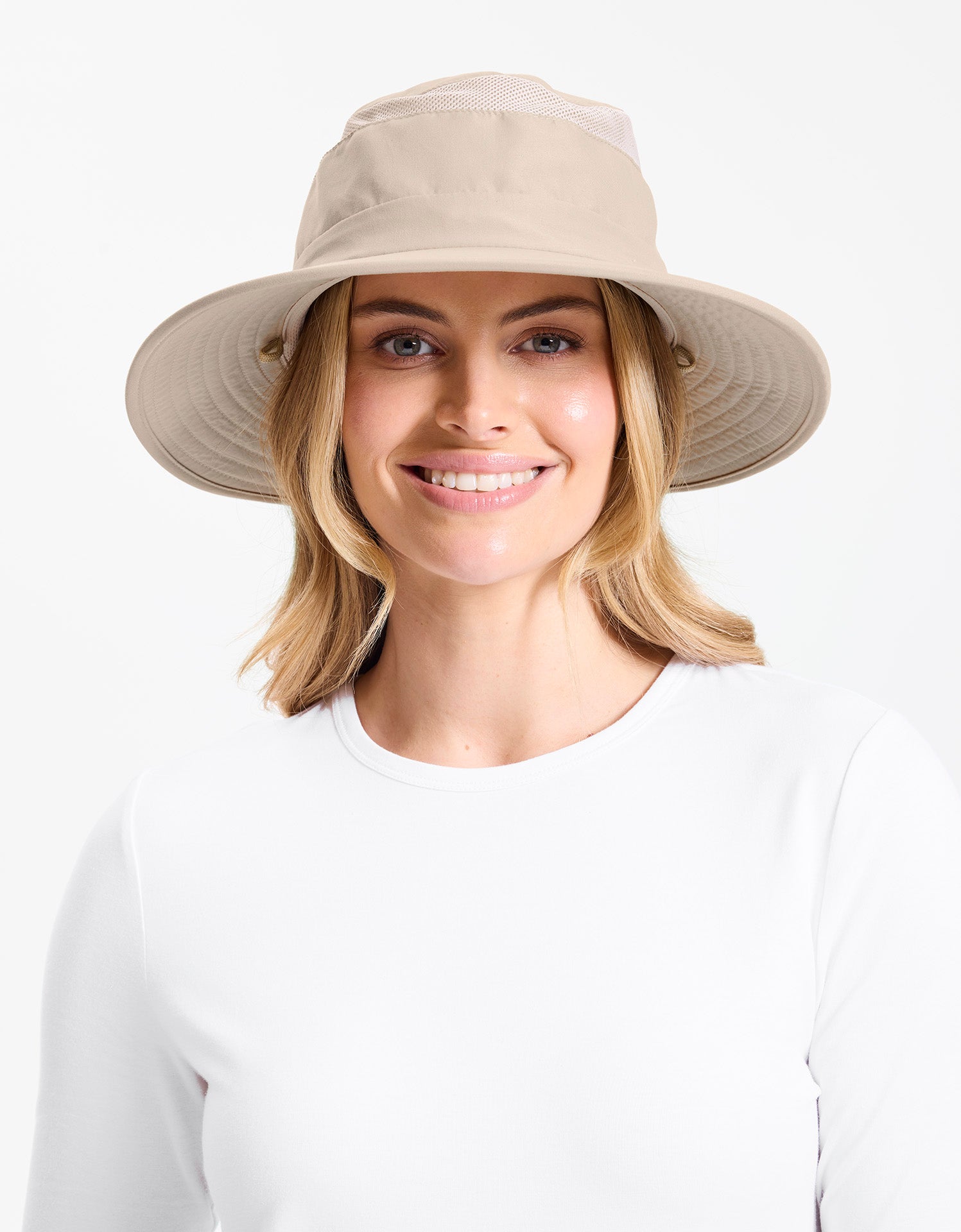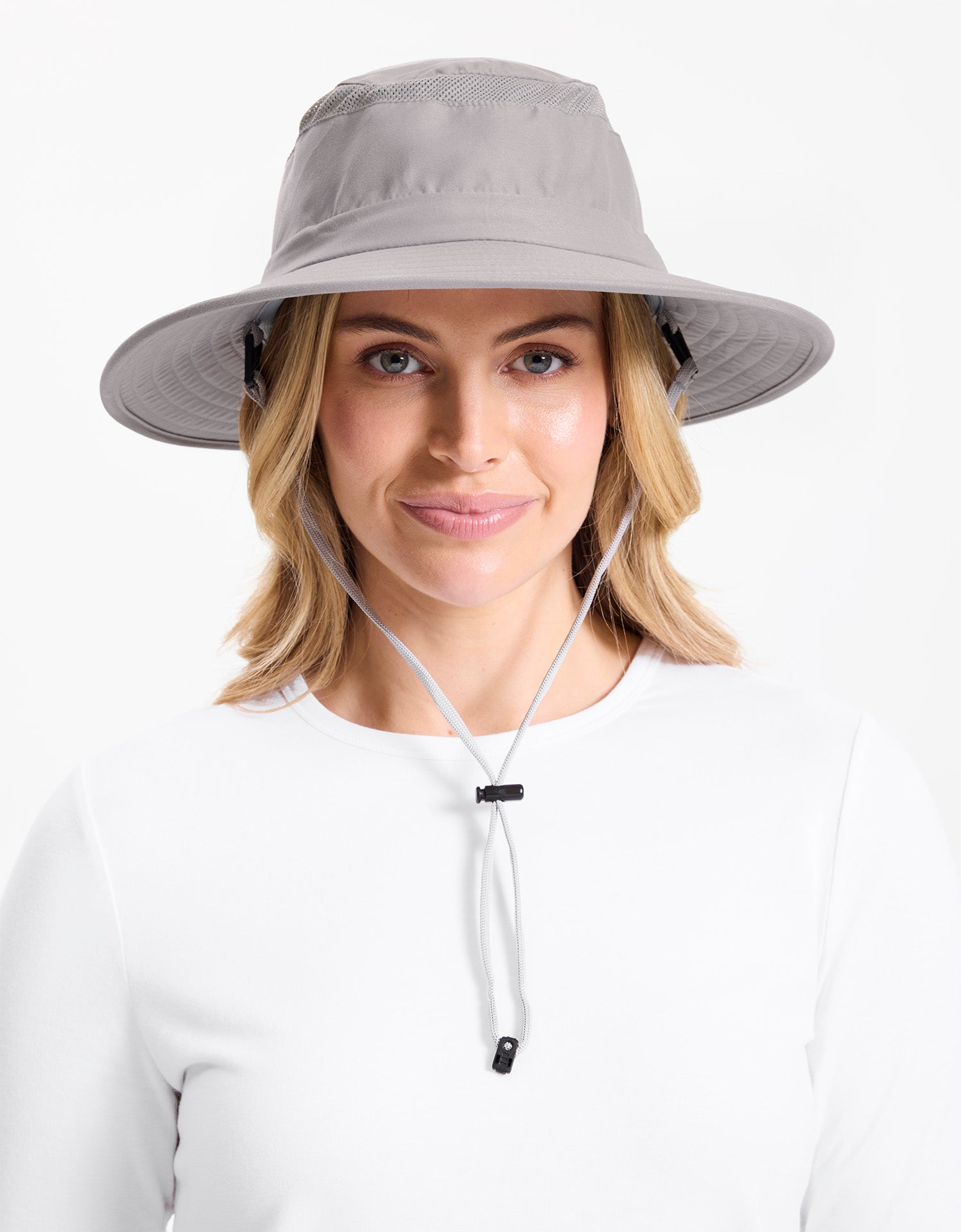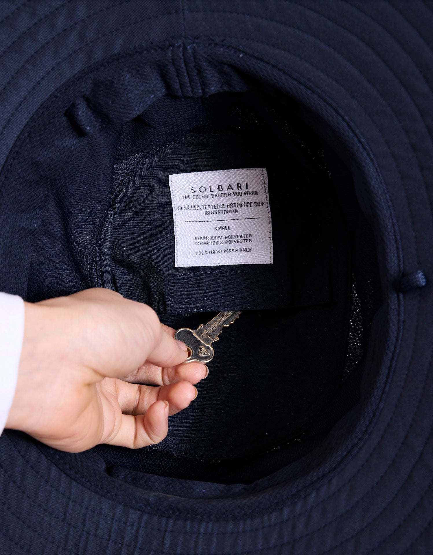 The Everyday Broad Brim Sun Hat offers UPF 50+ protection with a 3.25" (8 cm) wide brim, lightweight fabric, breathability, and a convenient internal small storage pocket.