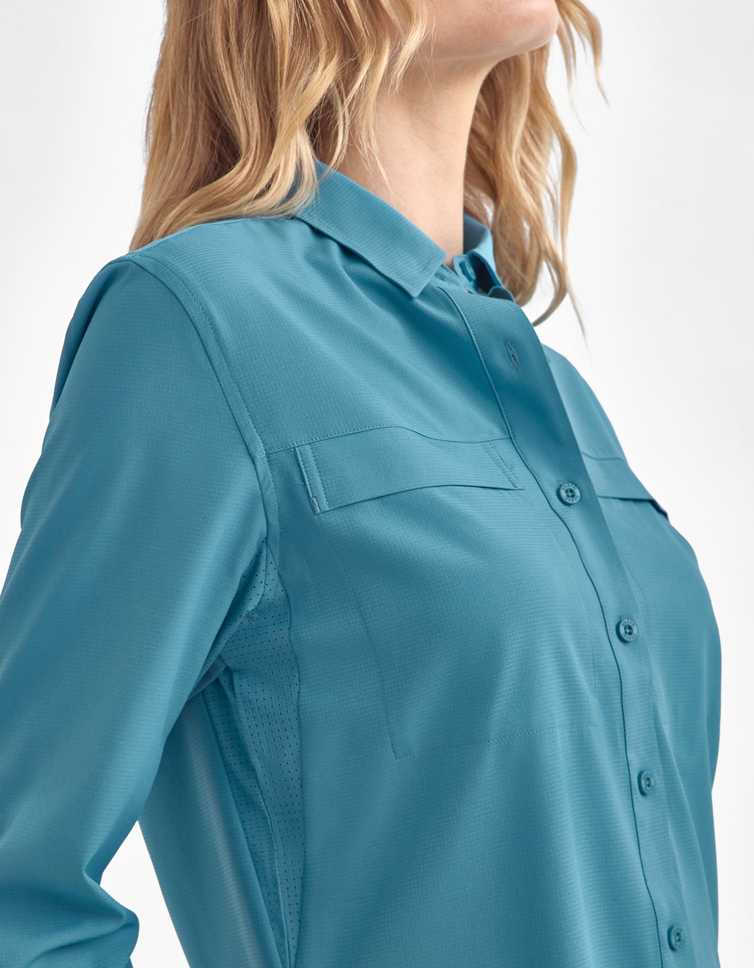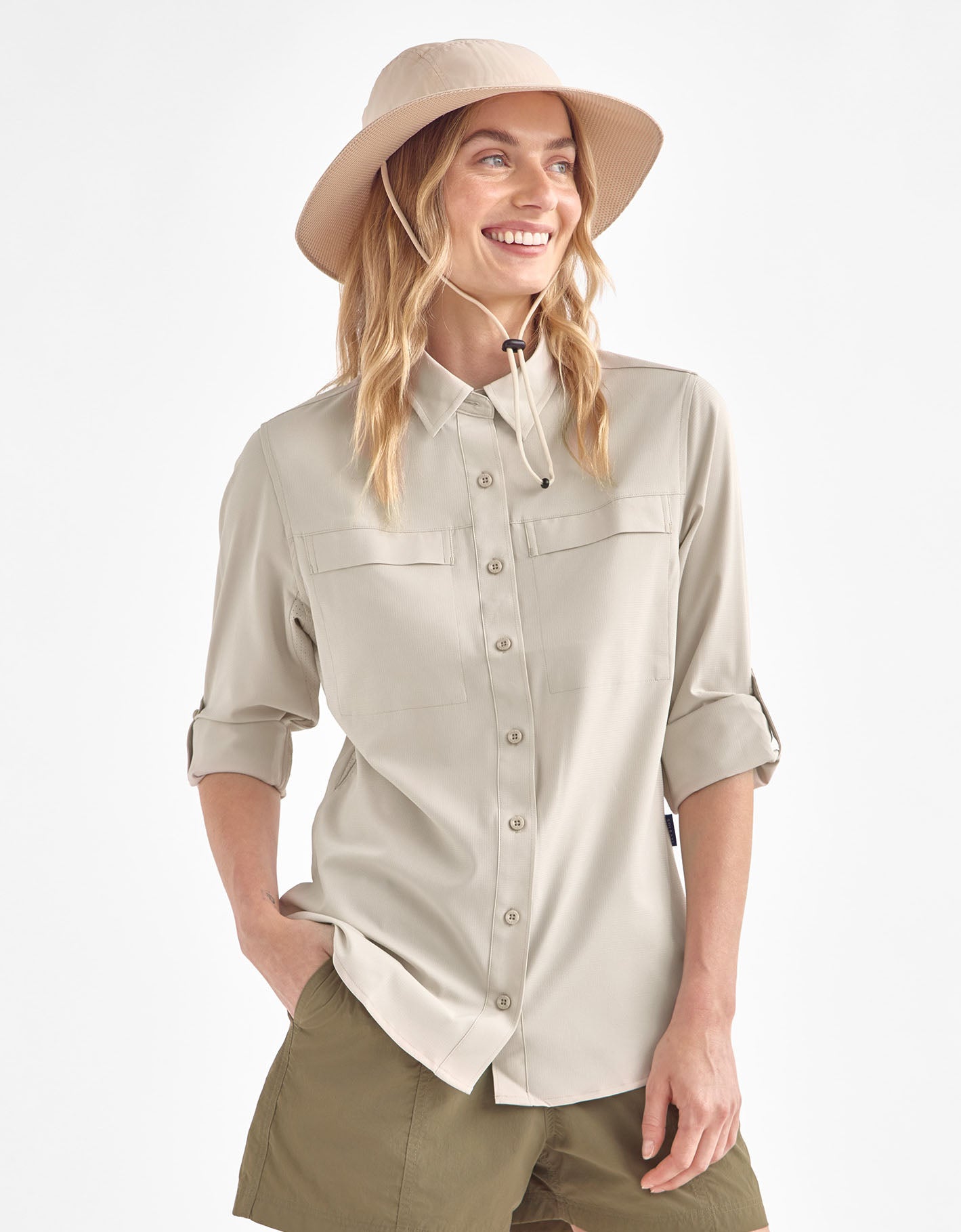 Our UPF 50+ Hiking Sun Shirt for women is perfect for outdoor activities, including walking, hiking, fishing, and gardening. There are two front chest pockets, which provide storage for small essentials. Made from eco-conscious fabric, it’s lightweight, quick-drying, moisture-wicking, and four-way stretch with roll-up sleeves.