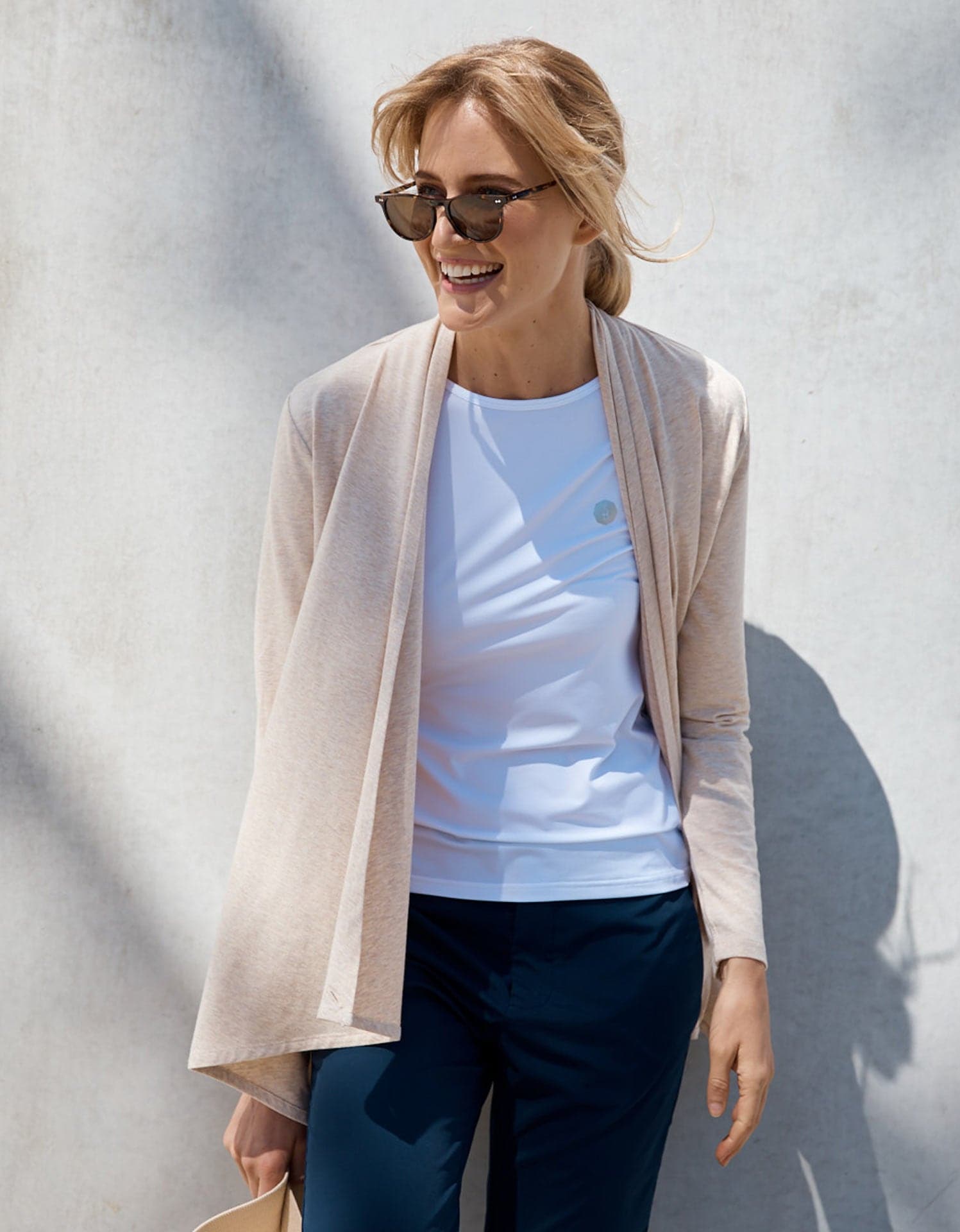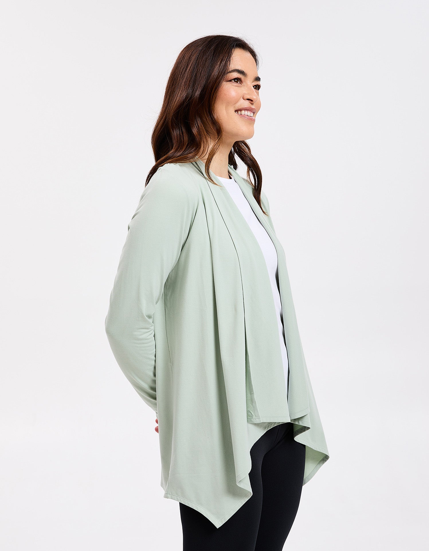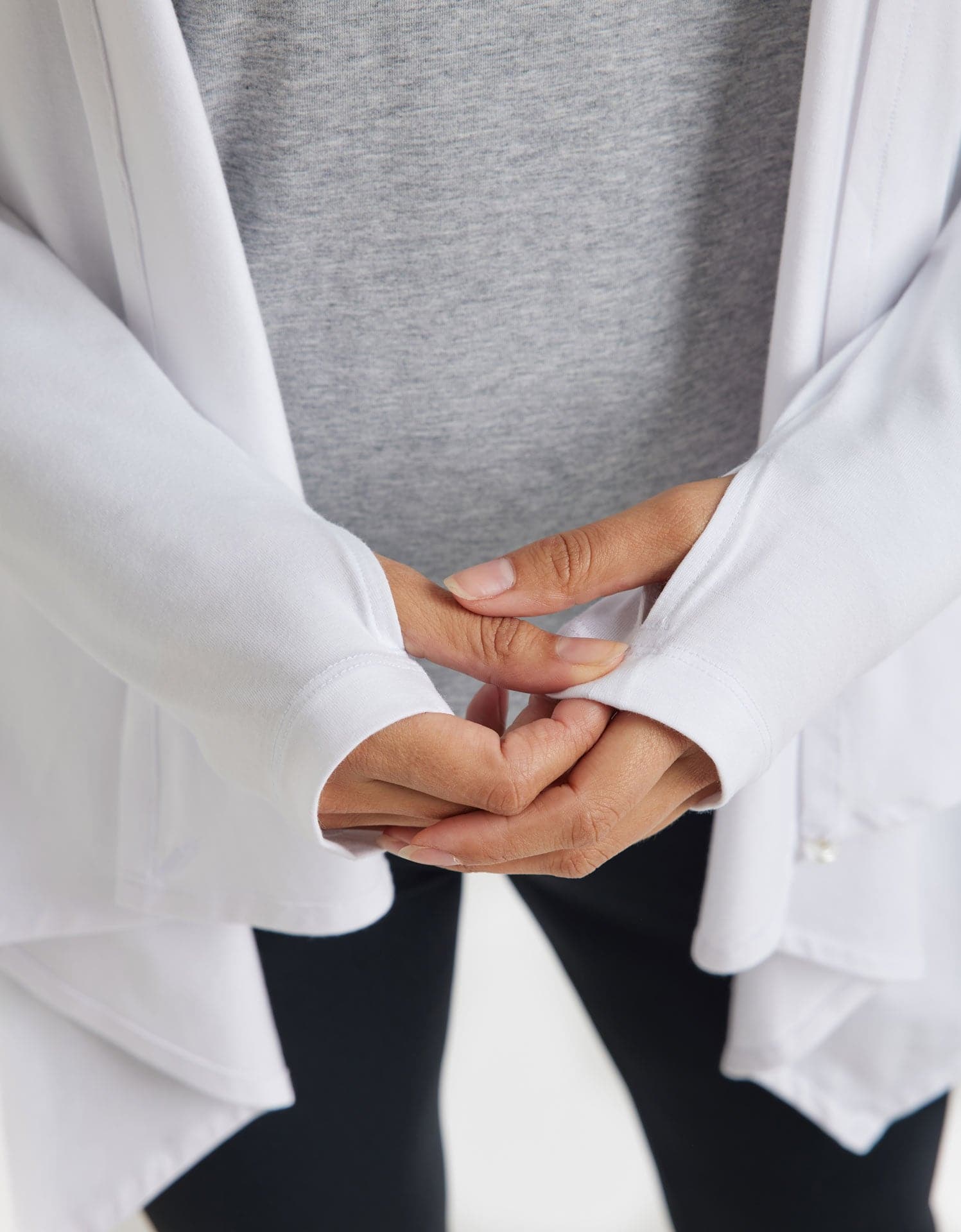 Stay stylish and protected with our UPF 50+ Luxe Sun Wrap. Designed for women with sensitive skin, it’s crafted from breathable cotton-bamboo and features elegant buttons, a ruched collar, and thumbholes for added coverage, so you can enjoy your day in the sun with confidence.