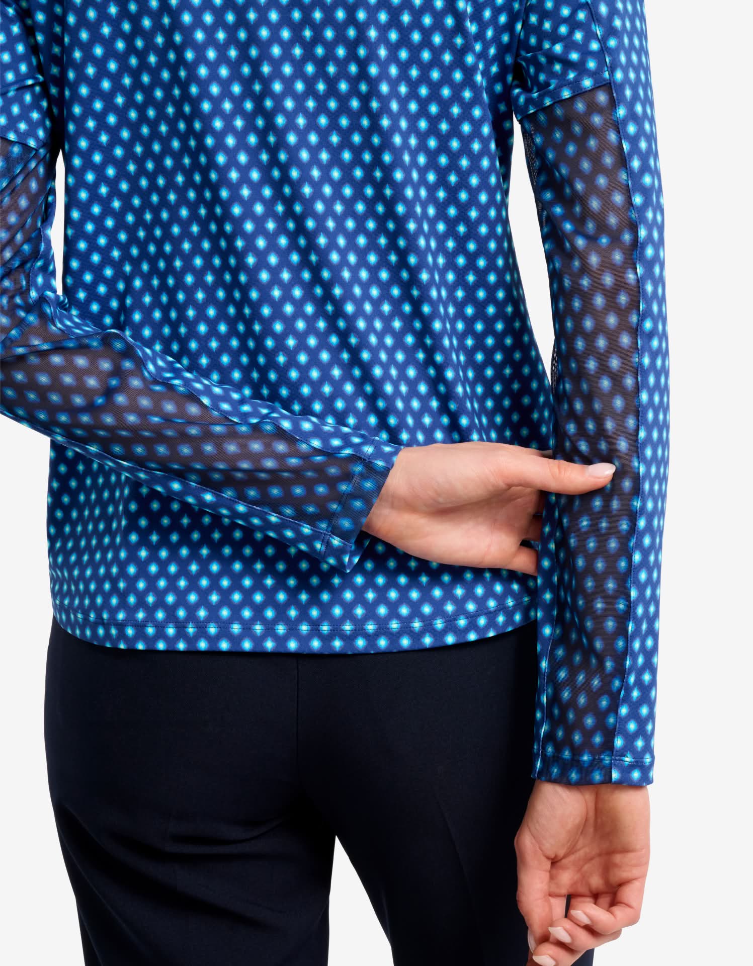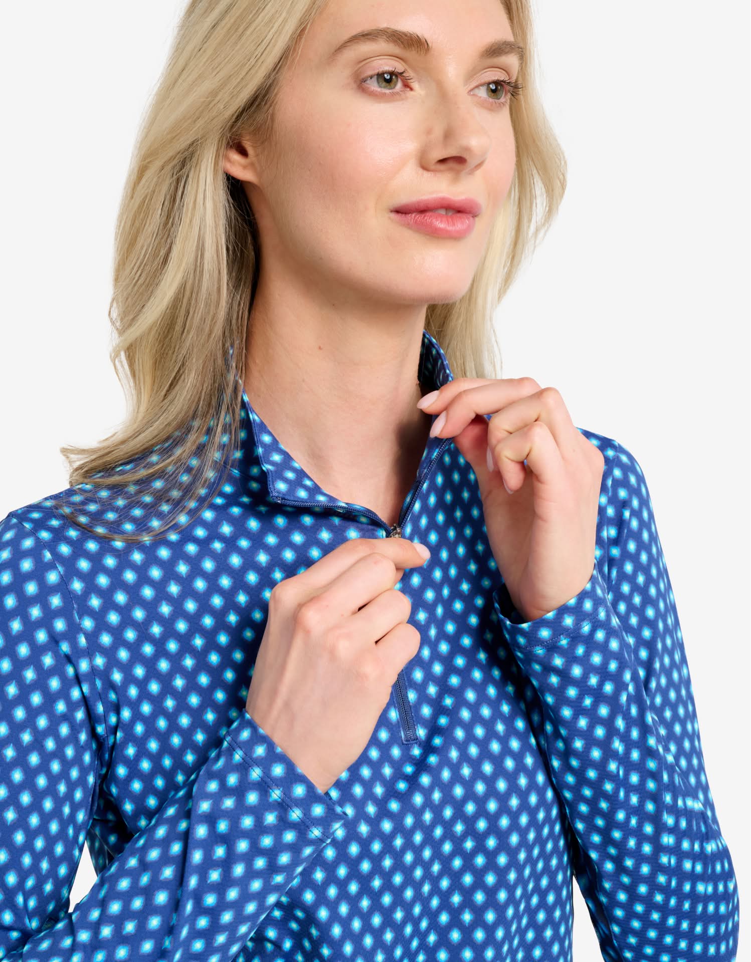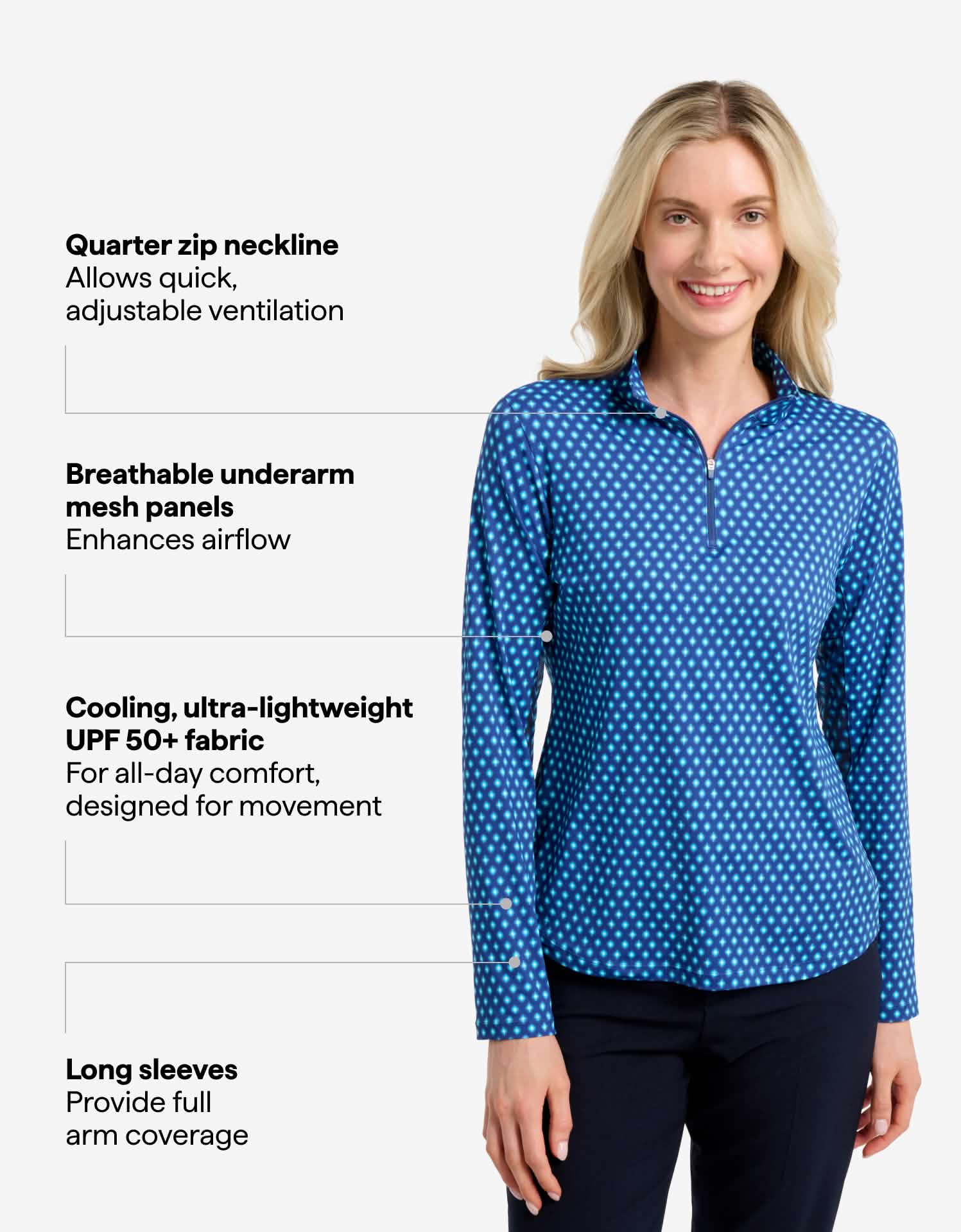 Featuring our Legacy Diamond print, it adds a touch of modern elegance to your sun-safe style. Mesh underarm panels enhance airflow, while the mock neck and long sleeves extend coverage. The quarter zip neckline allows easy ventilation, keeping you cool and confident all day long.