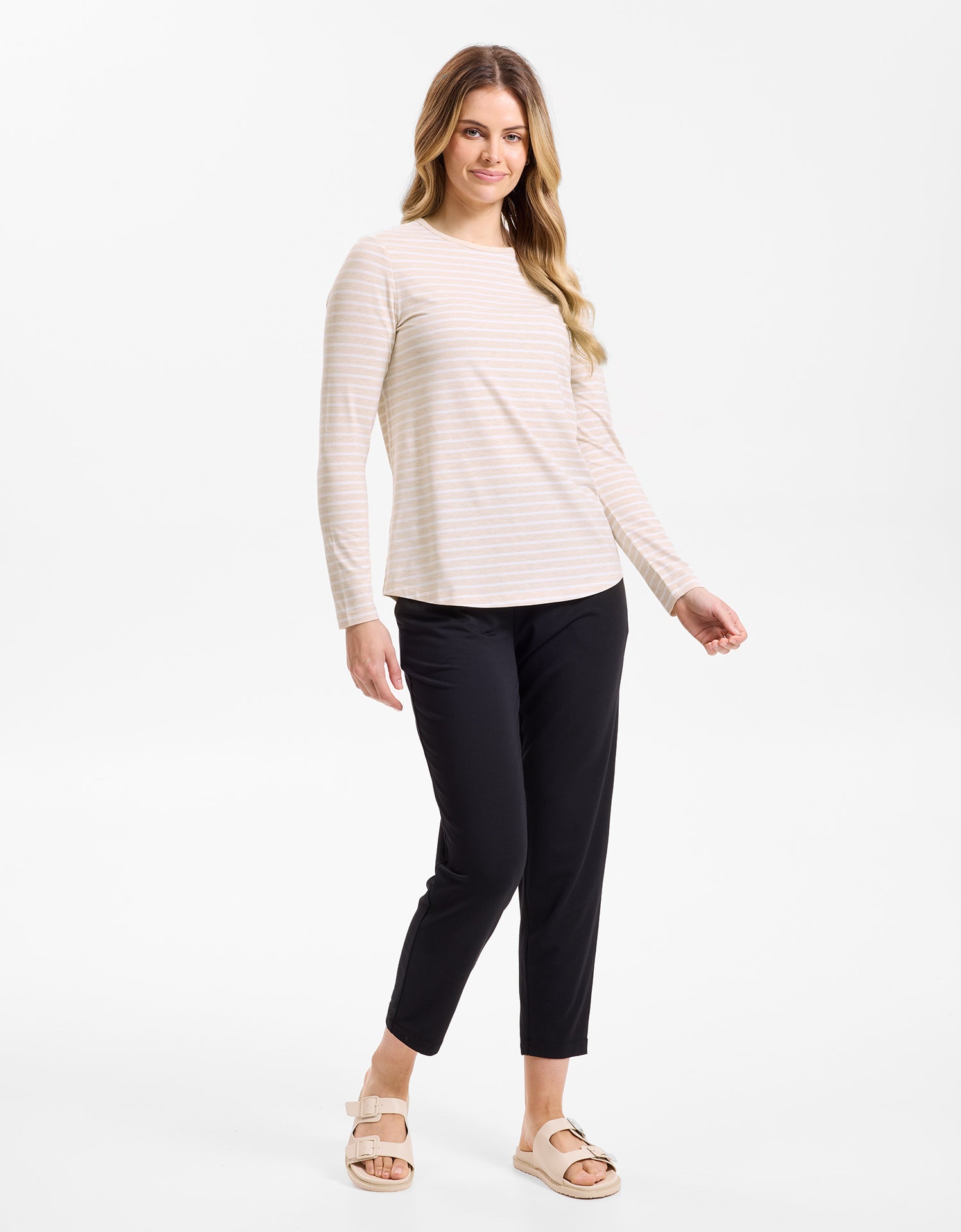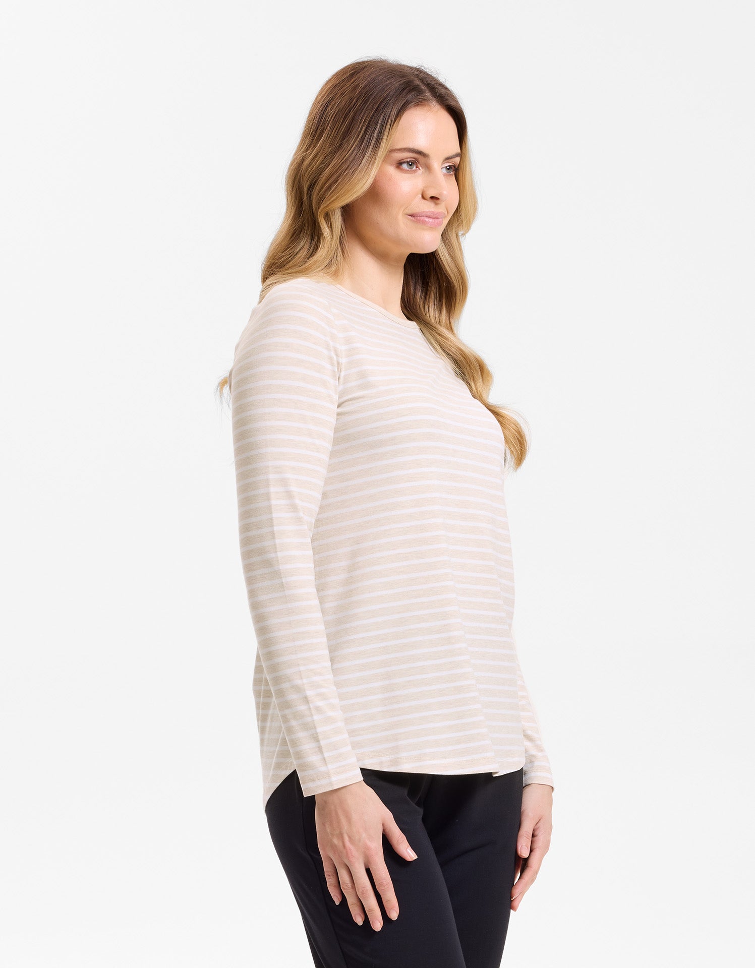 Introducing our Striped Loose Fit Long Sleeve Swing Top, a stylish update to a customer favourite. Featuring a loose fit silhouette, curved hem, discreet thumbholes, and breathable UPF 50+ fabric, it offers effortless, sun-safe comfort.