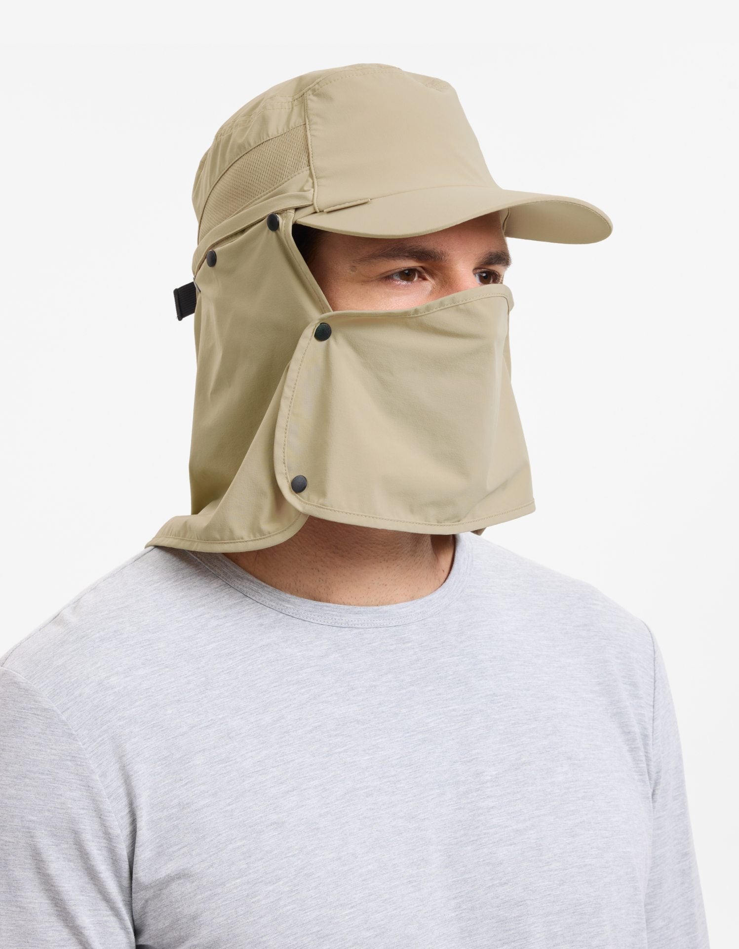 Lightweight side panels shield the ears and neck, fastening at the front with press studs for optional chin and mouth coverage. Wear it as a full-face guard on high UV days or as a ventilated cap for everyday protection — it adapts to your environment and your needs.