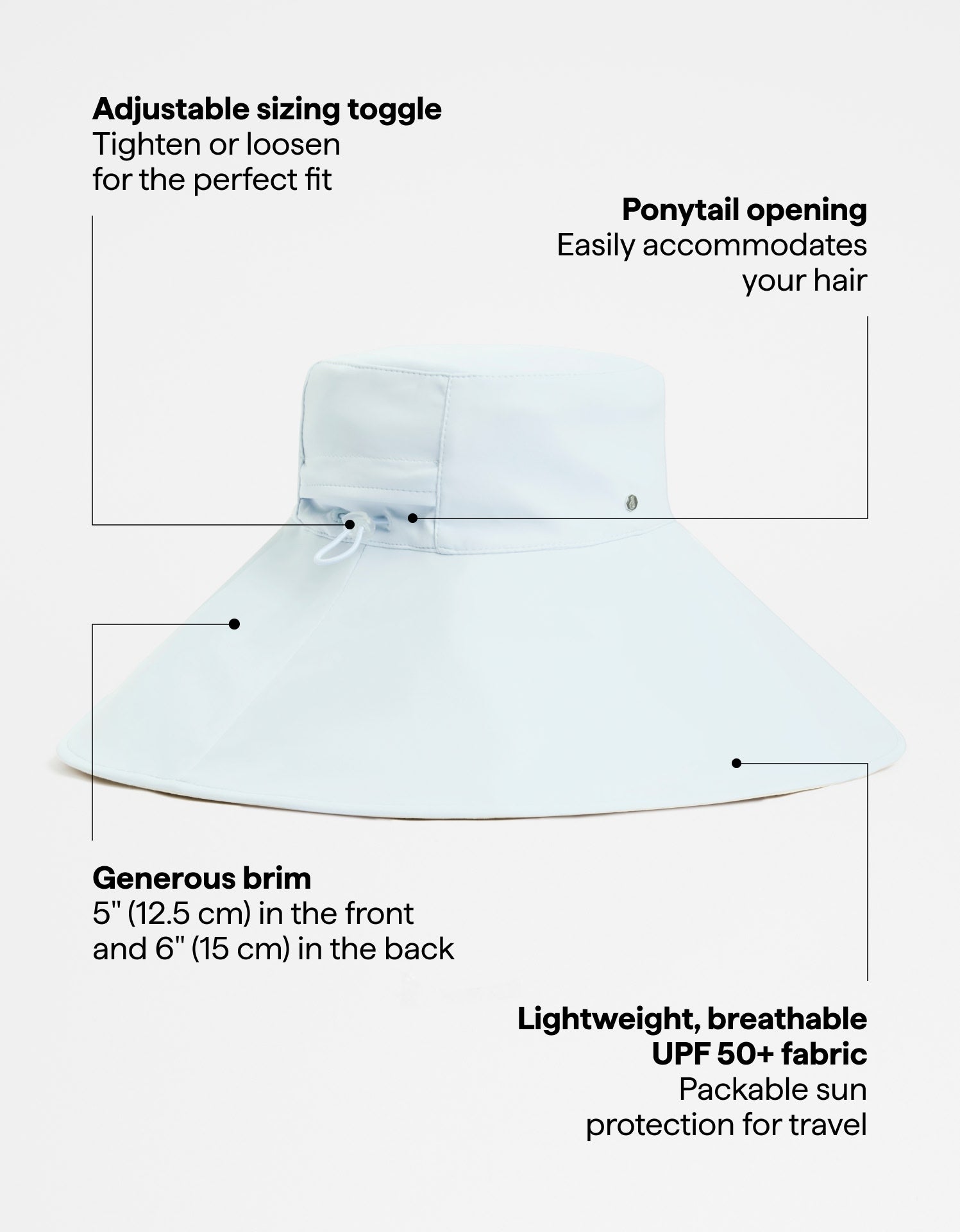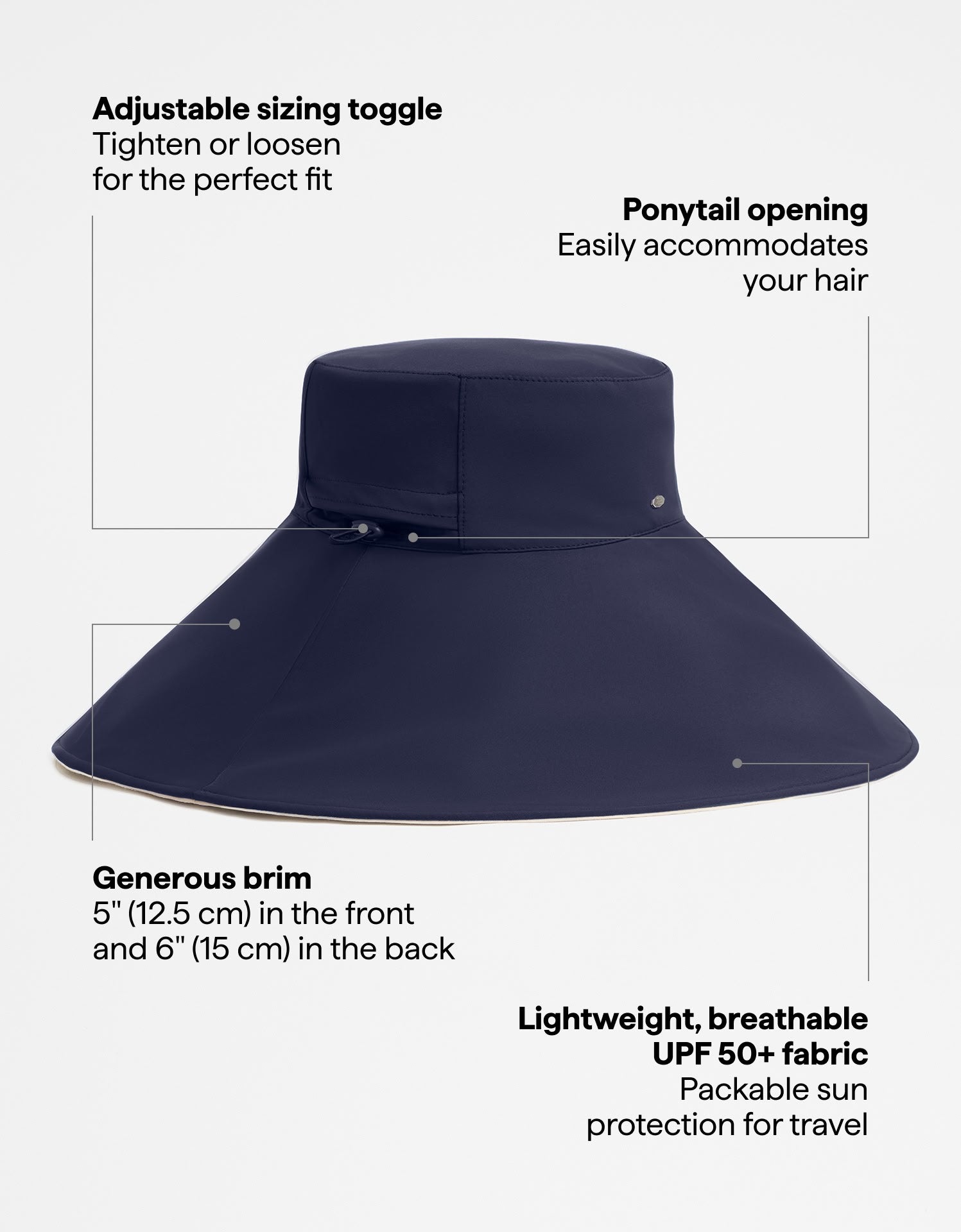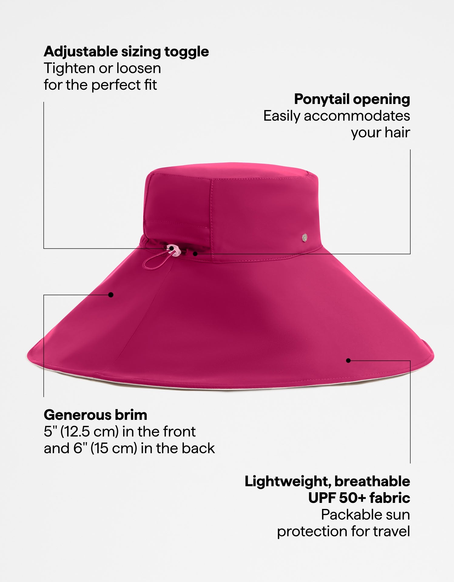 Experience reliable sun protection with our women's ultra-wide brim sun hat, featuring a 5" (12.5 cm) front brim and 6" (15 cm) back brim. With a wired, shapeable brim, adjustable sizing, ponytail opening, and detachable chin strap, it offers all-day comfort, style, and coverage.