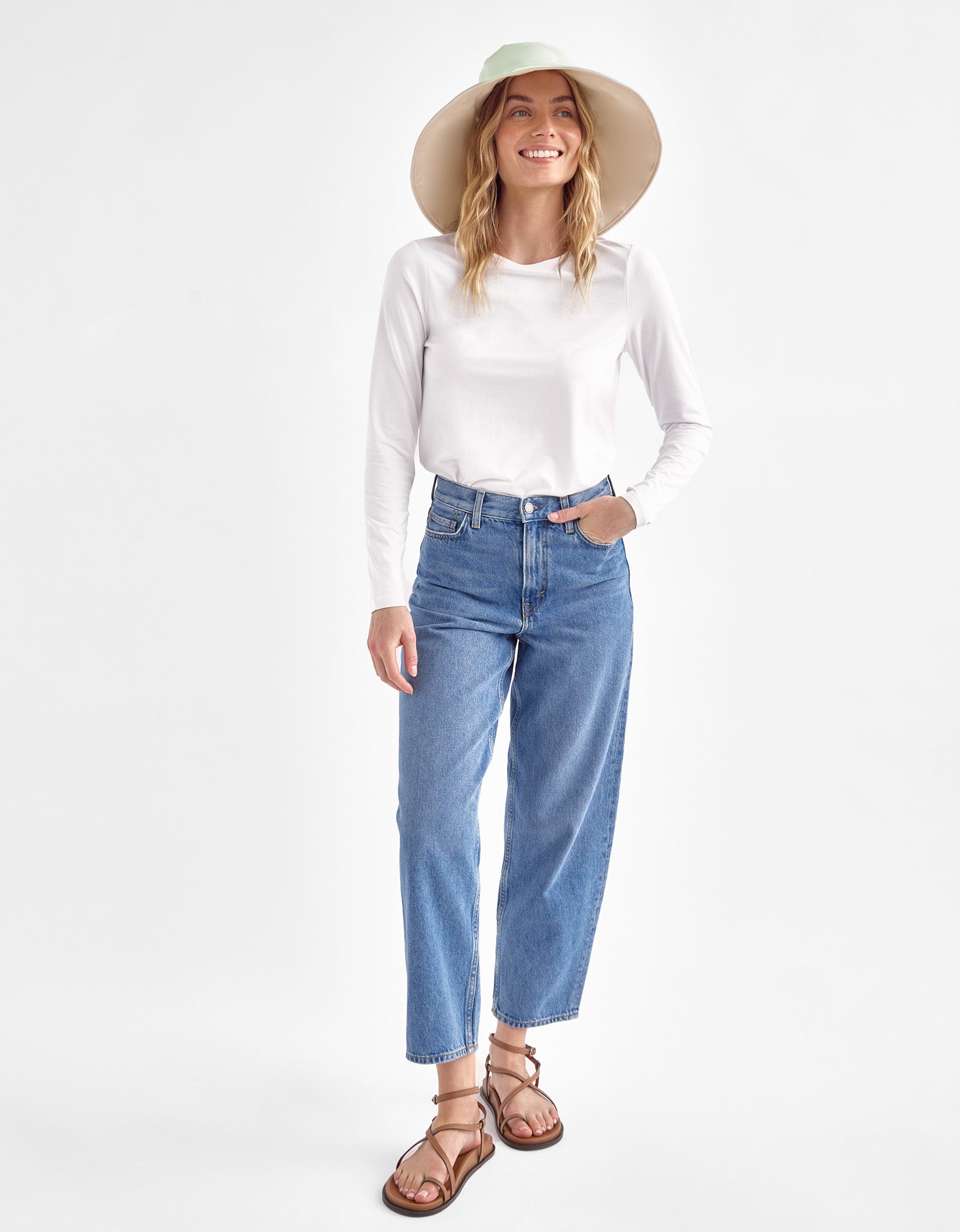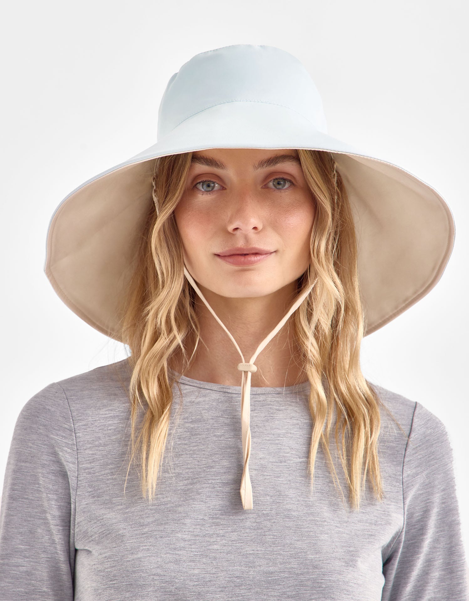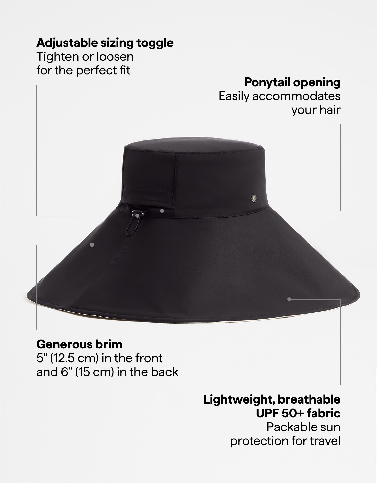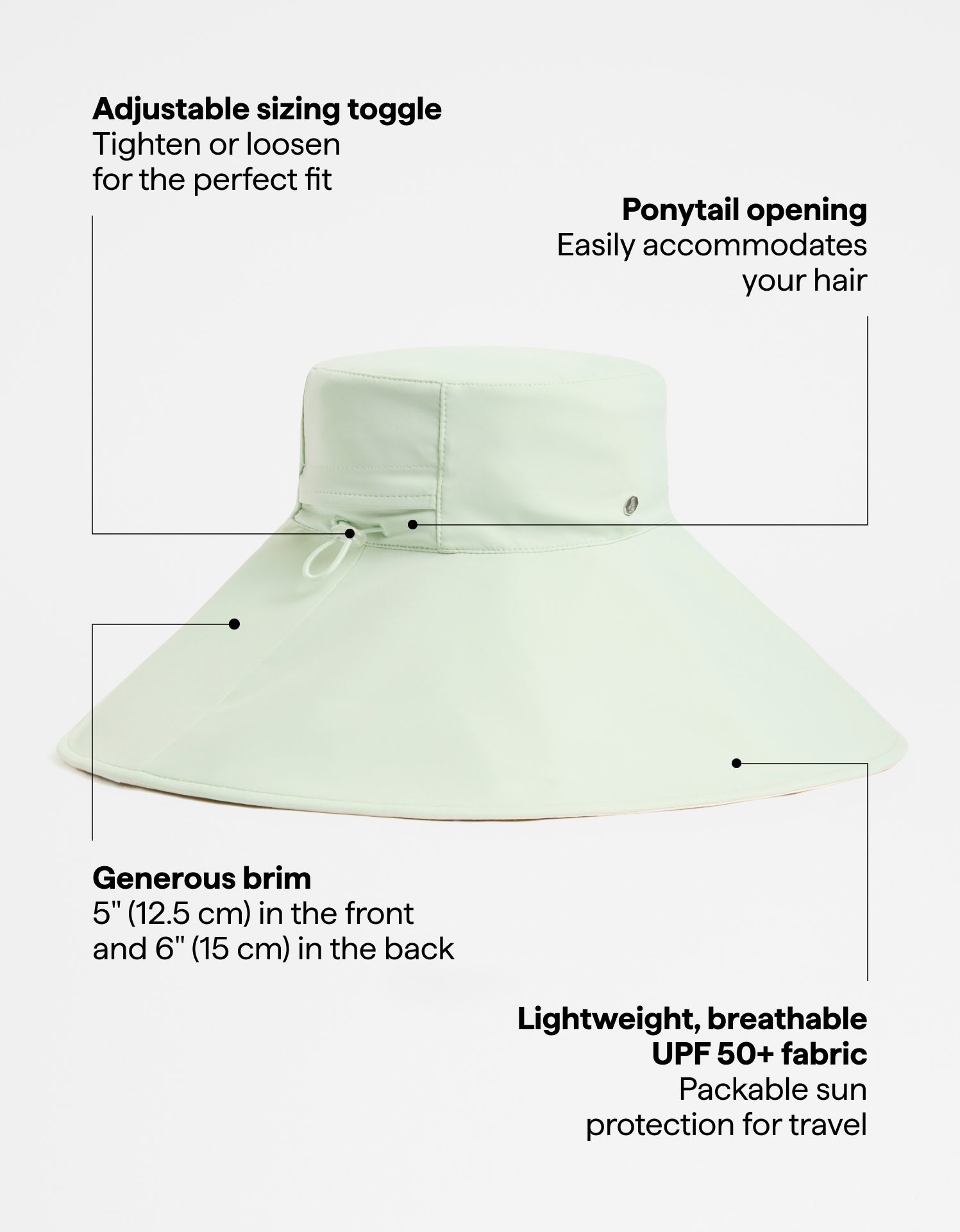 Experience reliable sun protection with our women's ultra-wide brim sun hat, featuring a 5" (12.5 cm) front brim and 6" (15 cm) back brim. With a wired, shapeable brim, adjustable sizing, ponytail opening, and detachable chin strap, it offers all-day comfort, style, and coverage.