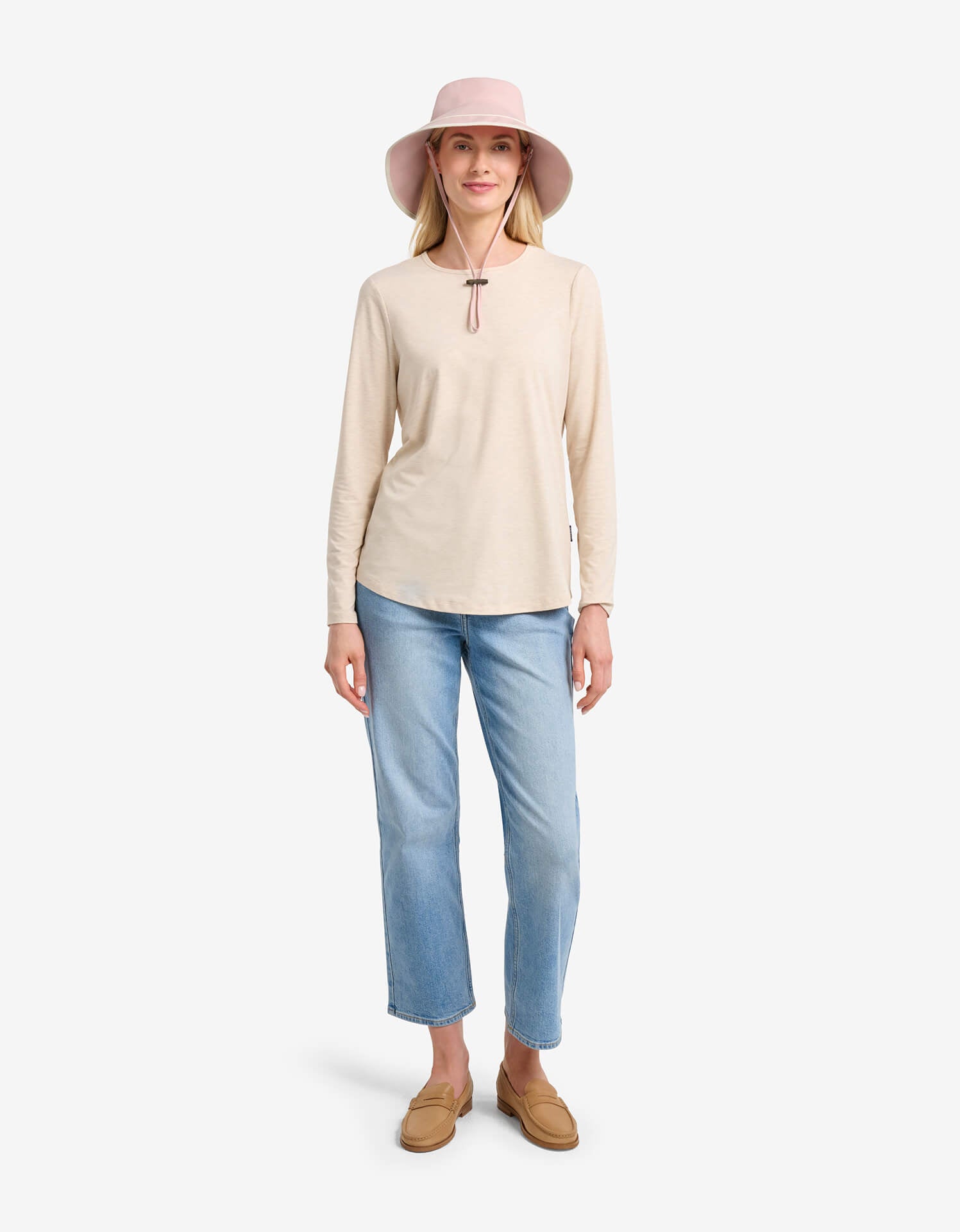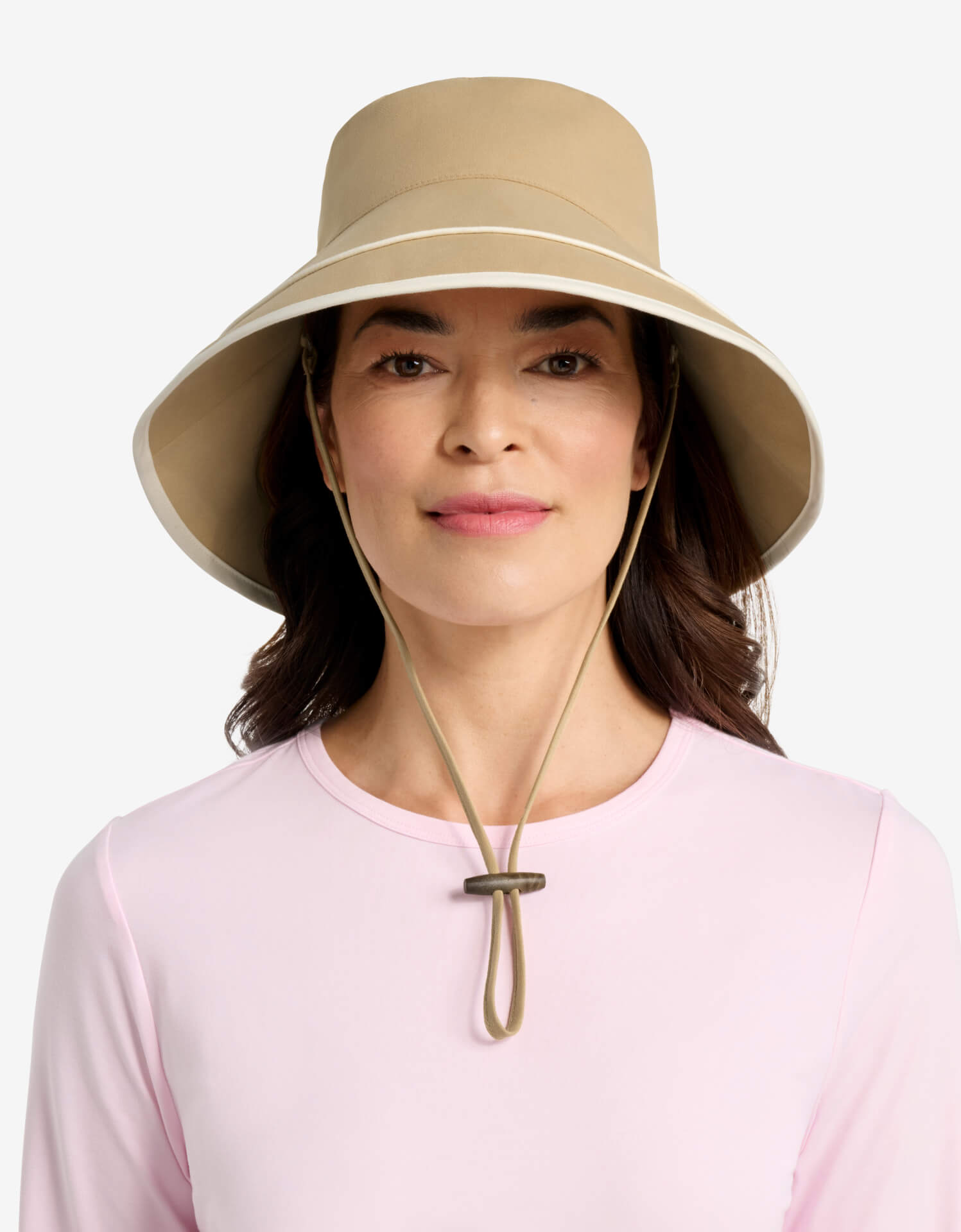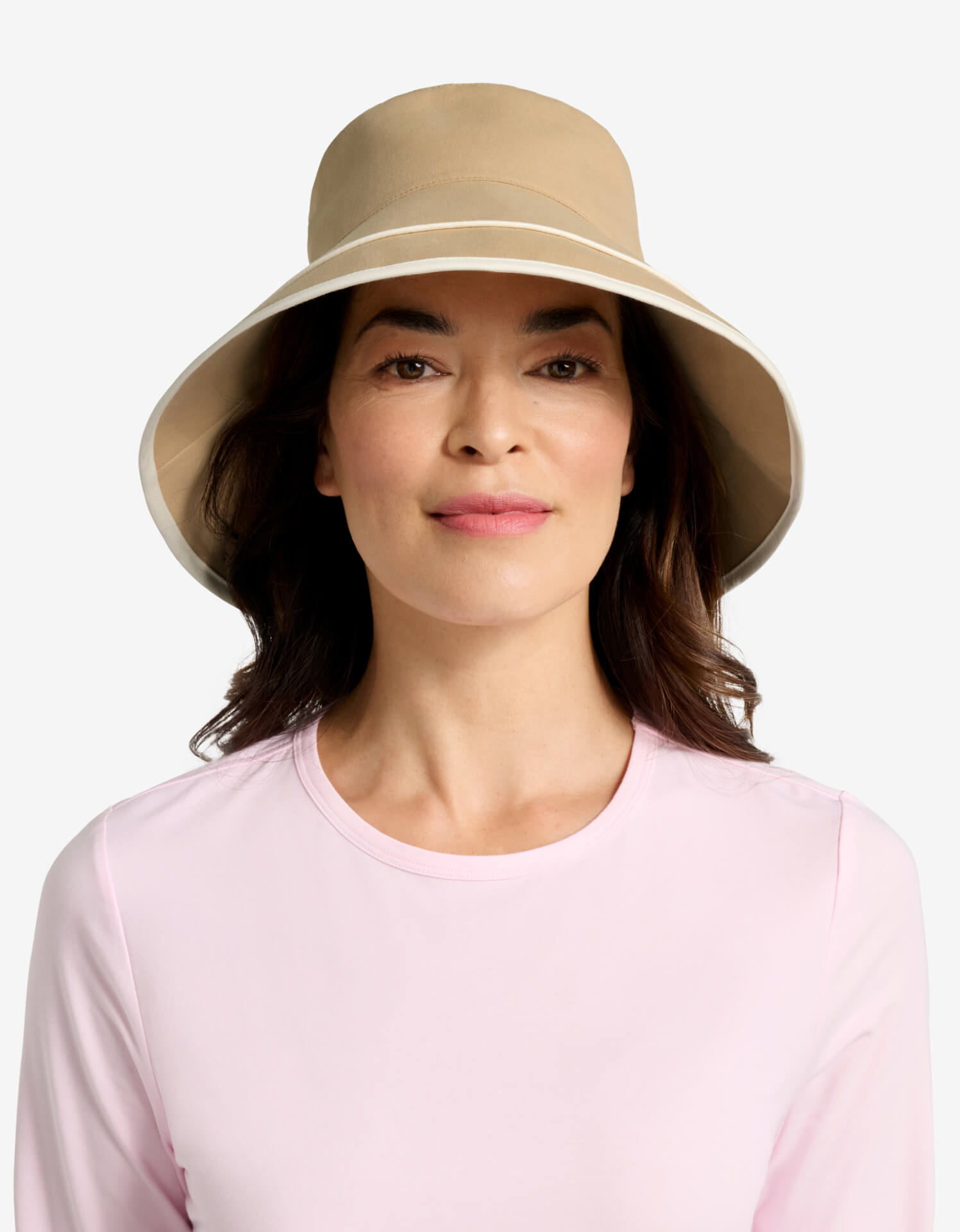 Our Vacation Sun Hat is a chic, packable UPF 50+ sun hat with a wide brim to keep your face protected from UV rays. With a ponytail opening and contrasting brim detail, it's a stylish option for every day sun protection.