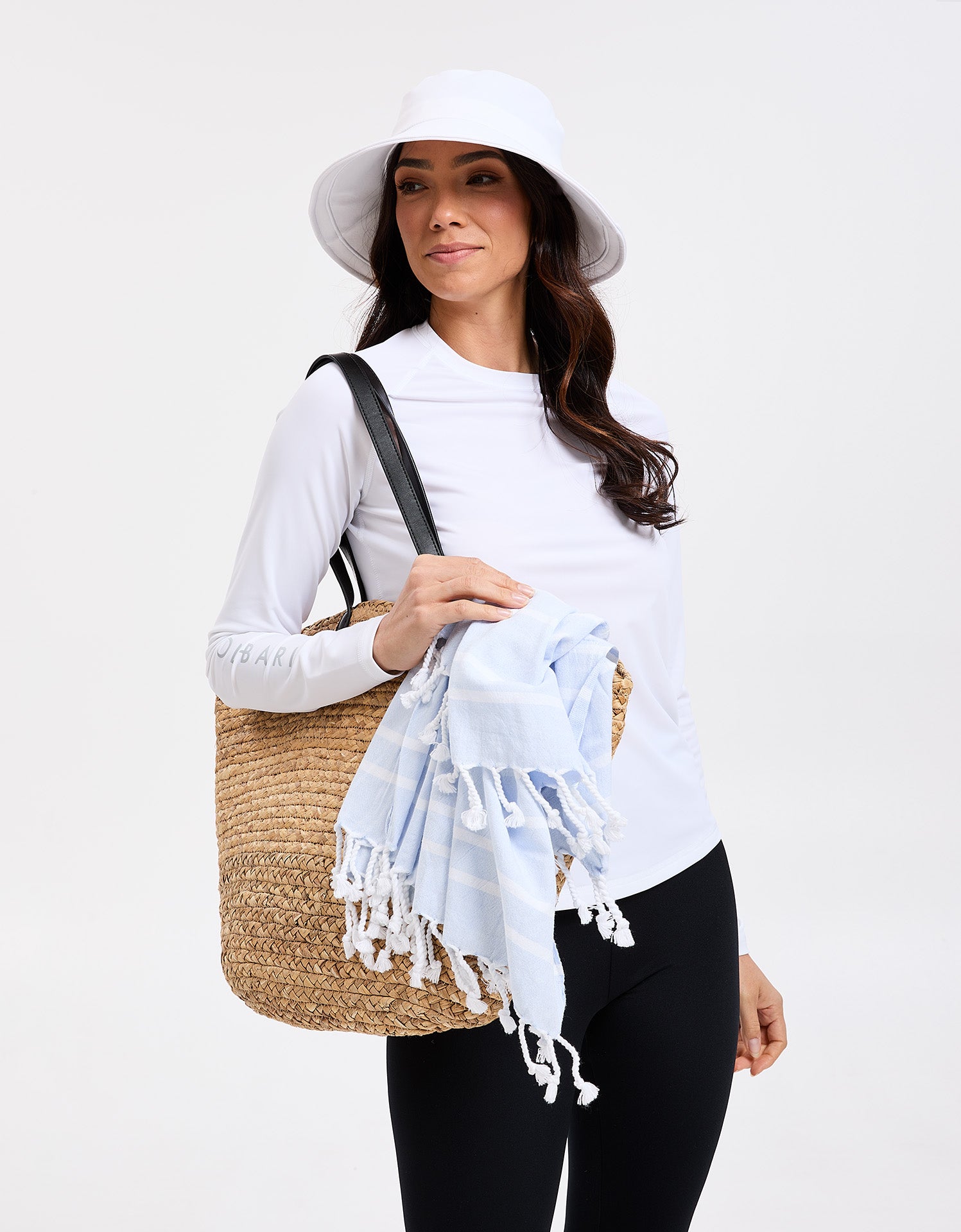 Perfect for beach and poolside adventures, this salt, quick-drying sun hat features a 3.5" (9 cm) front brim and 2.75" (7 cm) back brim for reliable shade. Designed with an adjustable fit, ponytail opening, and detachable chin strap, it offers versatile comfort and style.